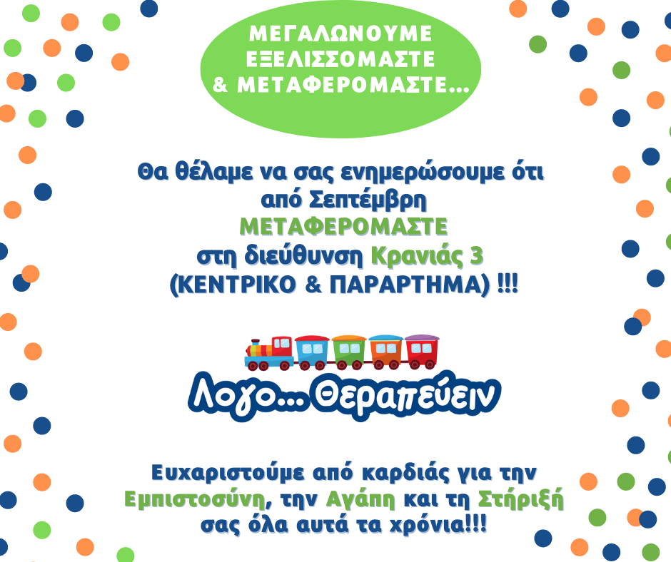 από Σεπτέμβρη ΜΕΤΑΦΕΡΟΜΑΣΤΕ σε νέα διεύθυνση, στην οδό Κρανιάς 3 (διπλά ακριβώς από το τωρινό παράρτημα)!!!