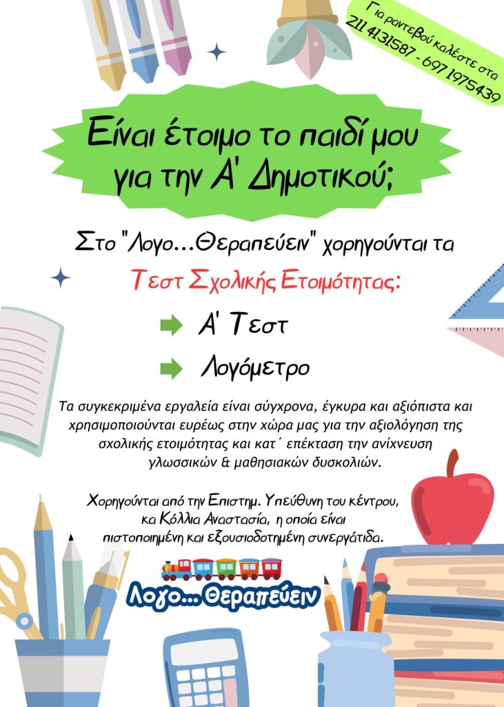 Τεστ Σχολικής Ετοιμότητας : Είναι το παιδί μου έτοιμο για την Α’ Δημοτικού; 29 Φεβρουαρίου 2024 από logotherapevein Κοινοποίηση: Mοιραστείτε στο Facebook(Ανοίγει σε νέο παράθυρο) Facebook Μοιραστείτε στο X(Ανοίγει σε νέο παράθυρο) Χ Μοιραστείτε στο LinkedIn(Ανοίγει σε νέο παράθυρο) LinkedIn Μοιράσου στο WhatsApp(Ανοίγει σε νέο παράθυρο) WhatsApp Στείλε ένα σύνδεσμο σε έναν φίλο(Ανοίγει σε νέο παράθυρο) Email Μου αρέσει! Φόρτωση... Σχετικά Δημοσιεύθηκε από logotherapevein Δείτε όλα τα άρθρα του/της logotherapevein